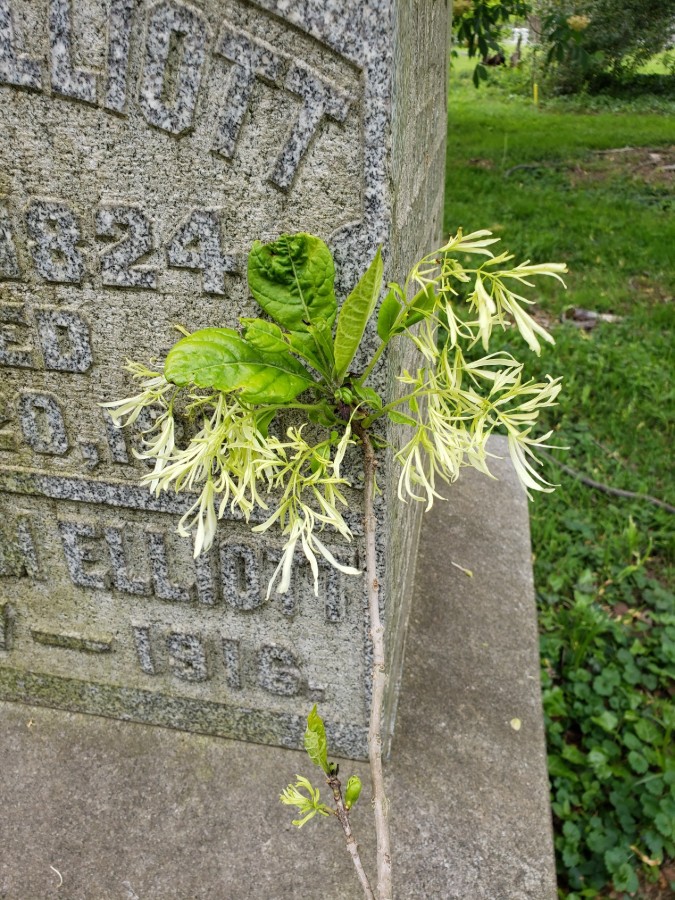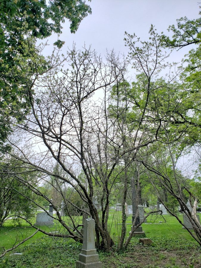 Spring Grove’s champion American Fringetree can be found in Ohio’s southernmost counties but is adaptable throughout the state. Although its Asian cousin grows as a small tree, this taxon grows as a large multi-leader shrub that can be trained to grow as a small multi-leader tree with continuous effort. This specimen is in declining condition, but we have one other specimen that is larger than the designated champion. The current champion measured its largest leader to 27-inches, a height of 24-feet height and 22-feet for crown spread totaling 54-points. The champion tree has its boulder closer to it and away from the companion American Fringetree at the northern side of Section 101.